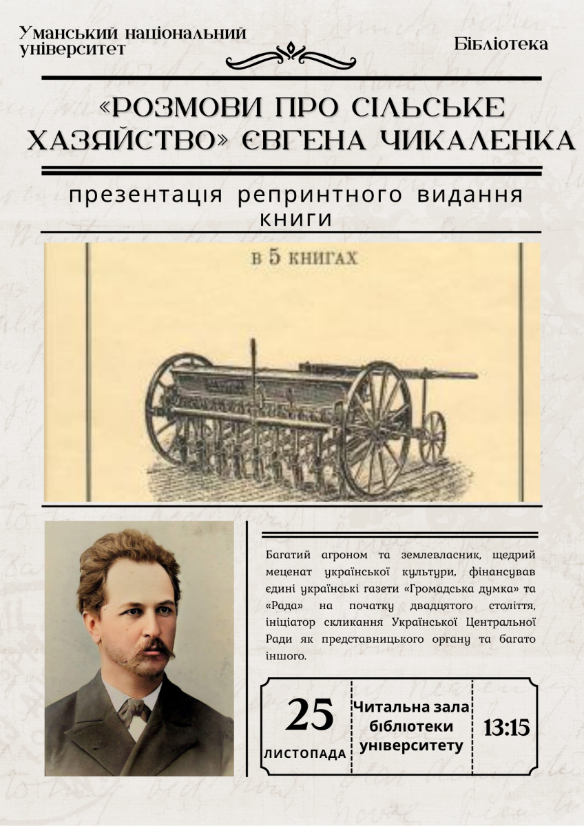 Бібліотека Уманського національного університету запрошує всіх, хто цікавиться та пишається історією нашої держави, на презентацію репринтного видання книги Євгена Чикаленка «Розмови про сільське хазяйство». Захід відбудеться 25 листопада о 13:15 у читальній залі №2.