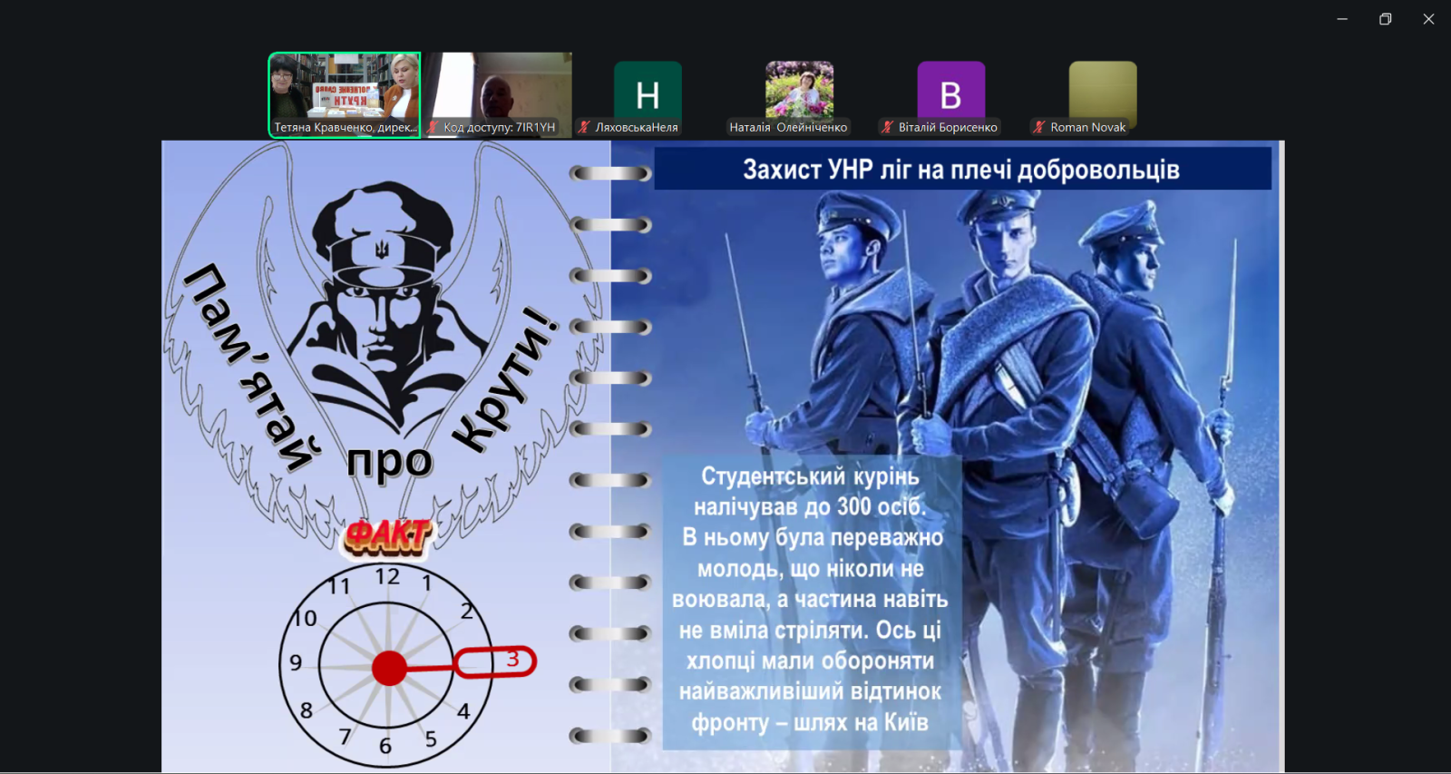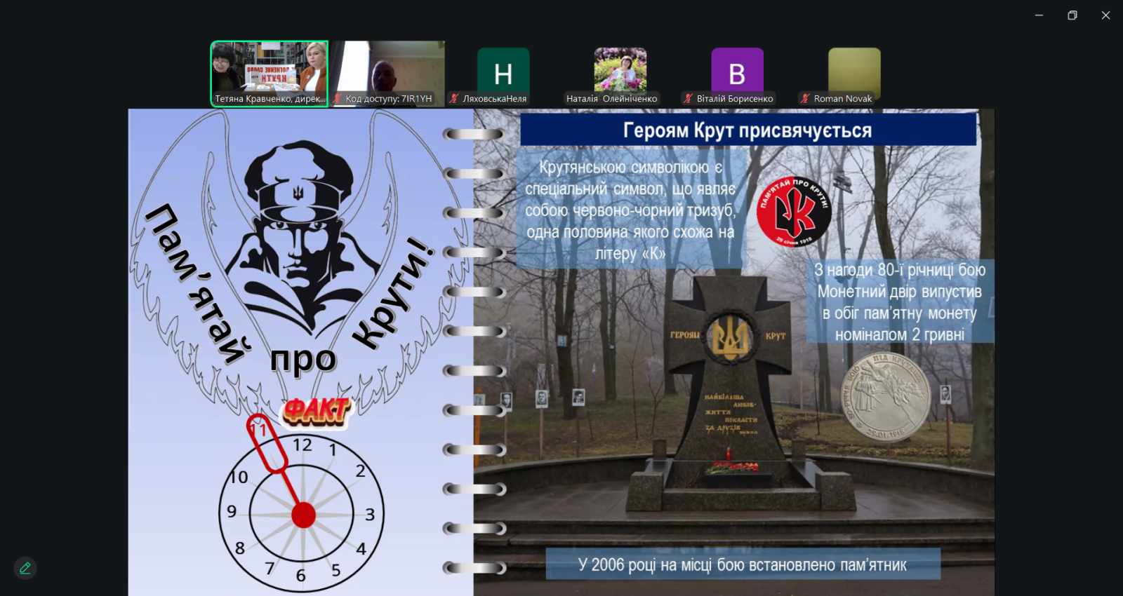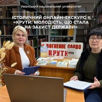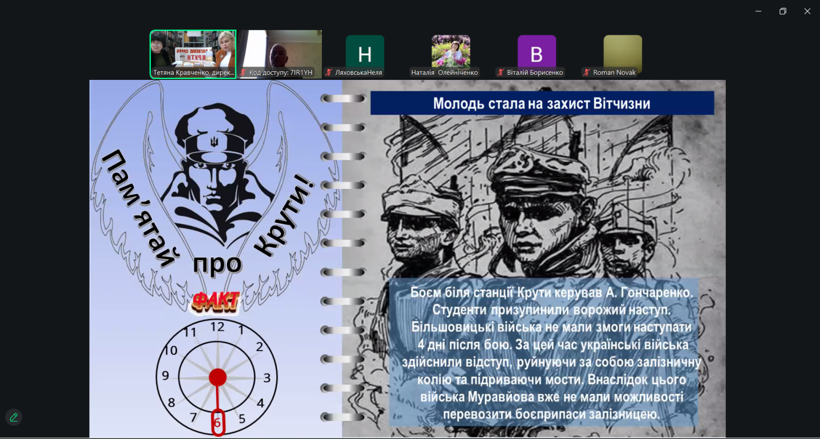 Онлайн-екскурс «Крути: молодість, що стала на захист держави» супроводжувався використанням інформаційних і документальних матеріалів та тематичних видань із фонду бібліотеки. Це дало змогу присутнім глибше осмислити історичні події початку ХХ століття та простежити їхній зв’язок із сучасними процесами боротьби України за свободу та незалежність.