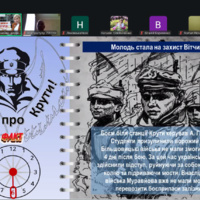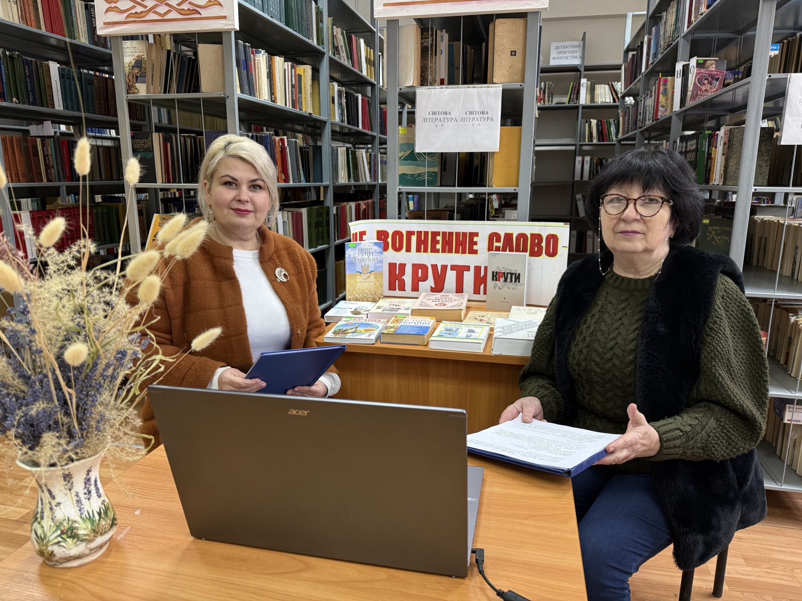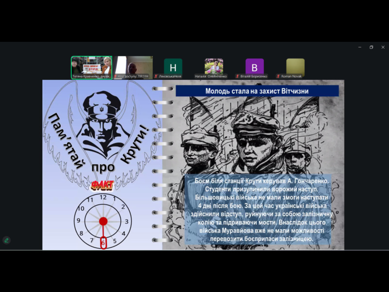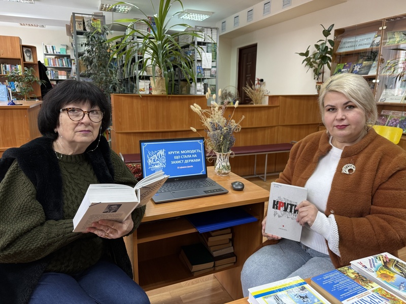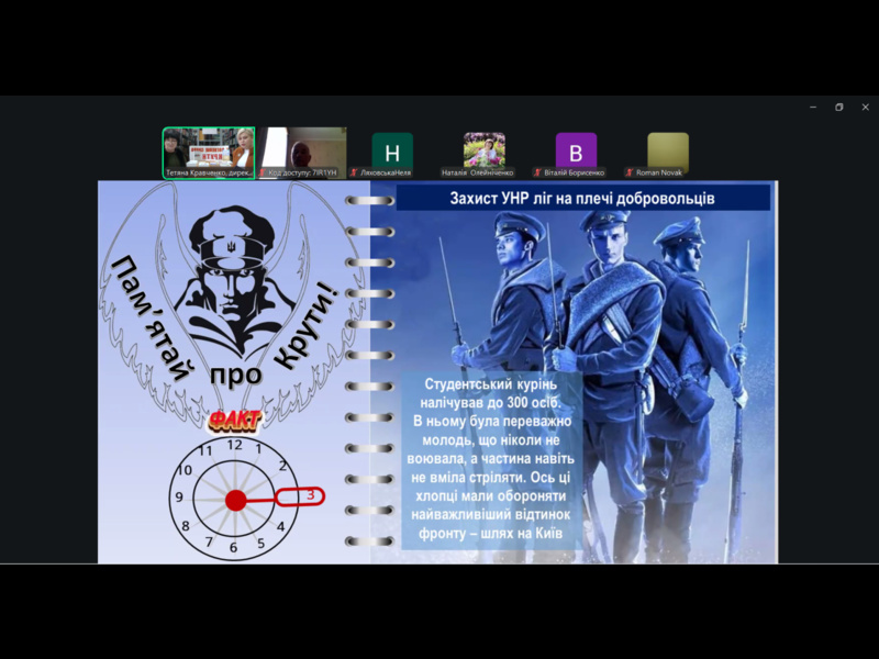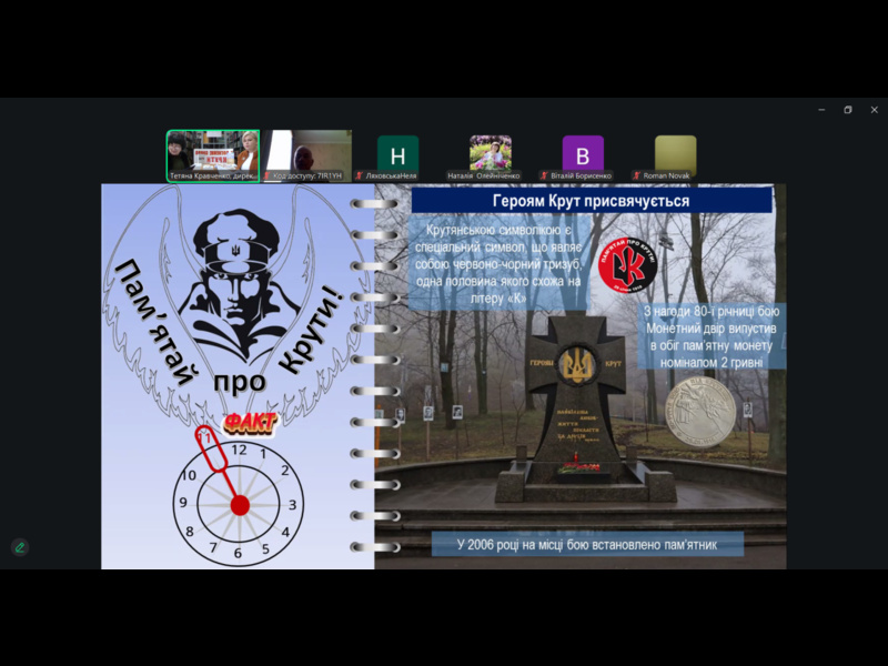 Онлайн-екскурс «Крути: молодість, що стала на захист держави» супроводжувався використанням інформаційних і документальних матеріалів та тематичних видань із фонду бібліотеки. Це дало змогу присутнім глибше осмислити історичні події початку ХХ століття та простежити їхній зв’язок із сучасними процесами боротьби України за свободу та незалежність.