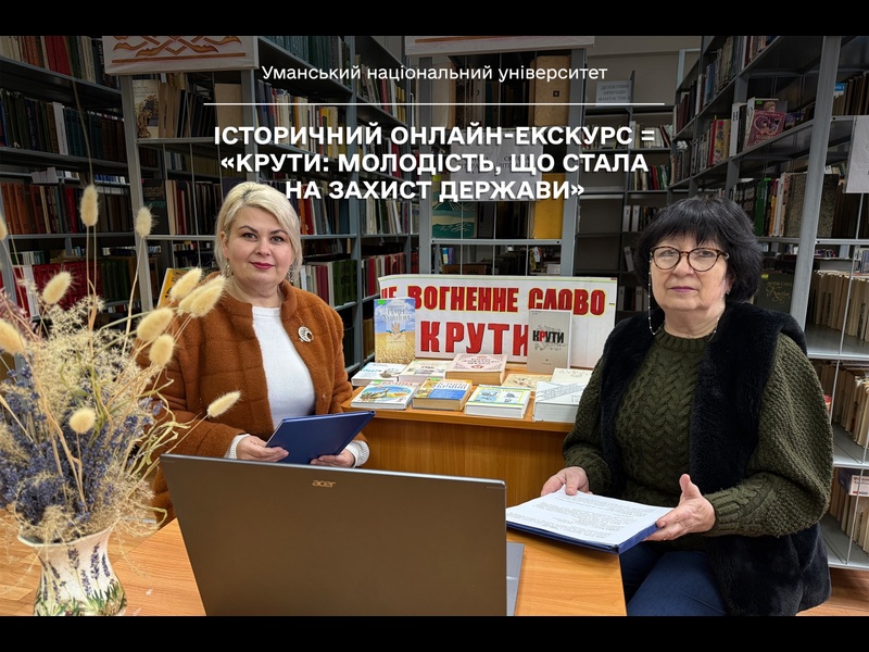 До Дня пам’яті Героїв Крут у бібліотеці Уманського національного університету відбувся історичний онлайн-екскурс «Крути: молодість, що стала на захист держави». Захід відбувся в онлайн-форматі на платформі Zoom та був спрямований на вшанування пам’яті українських студентів і гімназистів, які 29 січня 1918 року проявили надзвичайну мужність і самопожертву в боротьбі за незалежність Української Народної Республіки.