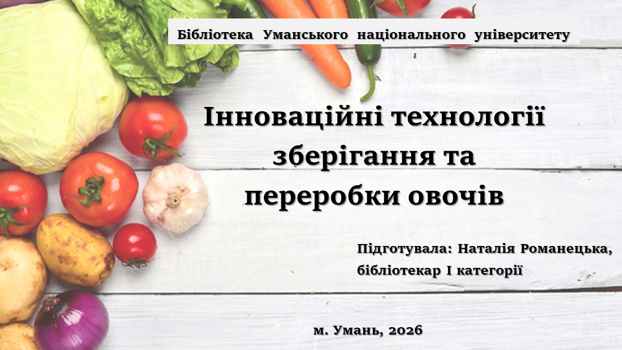 Бібліотека Уманського національного університету для допомоги у навчальному процесі презентує віртуальну книжкову виставку «Інноваційні технології зберігання та переробки овочів». Виставка підготовлена для кращого засвоєння матеріалу, проведення досліджень і аналізів на лабораторних і практичних заняттях, стане у нагоді майбутнім спеціалістам у сфері технології зберігання та переробки овочів. До книжкової виставки увійшли підручники, посібники та монографії, якими можуть скористатися не тільки здобувачі освіти, науковці, а навіть власники різних категорій підприємств.