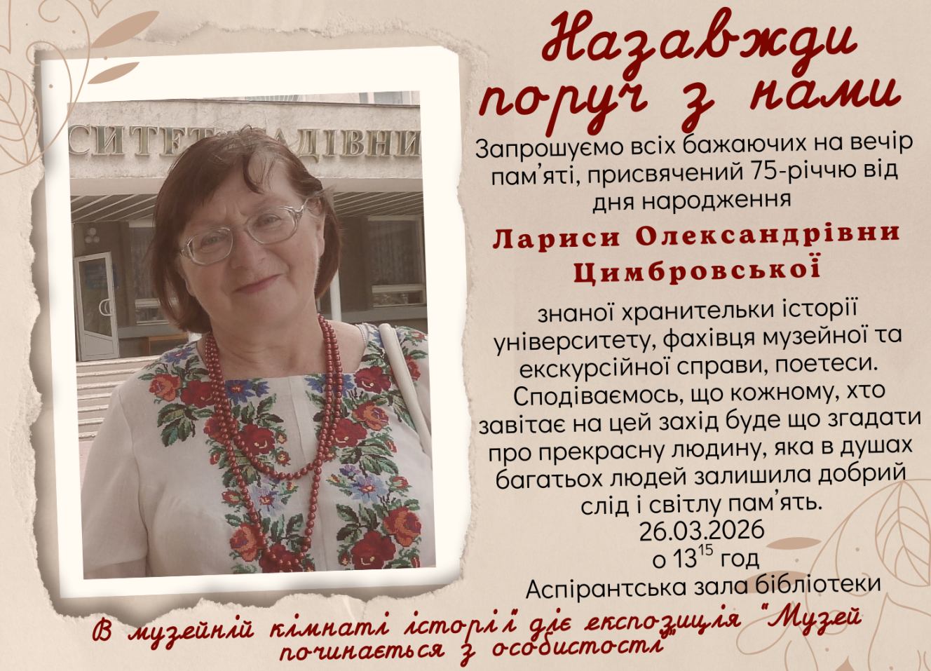 Запрошуємо друзів, знайомих, колег і всіх зацікавлених на вечір пам’яті, присвячений 75-річчю від дня народження Лариси Олександрівни Цимбровської, знаної хранительки історії університету, фахівця музейної та екскурсійної справи, поетеси, яка понад 25 років опікувалась музеєм історії УНУ.