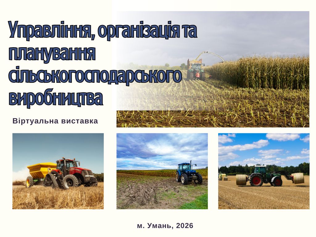 Саме від сумлінної праці аграріїв залежить урожай в Україні, а відтак – і продовольча безпека та економічний розвиток. Запрошуємо переглянути віртуальну виставку «УПРАВЛІННЯ, ОРГАНІЗАЦІЯ ТА ПЛАНУВАННЯ СІЛЬСЬКОГОСПОДАРСЬКОГО ВИРОБНИЦТВА», яка допоможе поєднати теоретичні знання і практичні навики та ефективно використовувати всі елементи виробничого процесу.